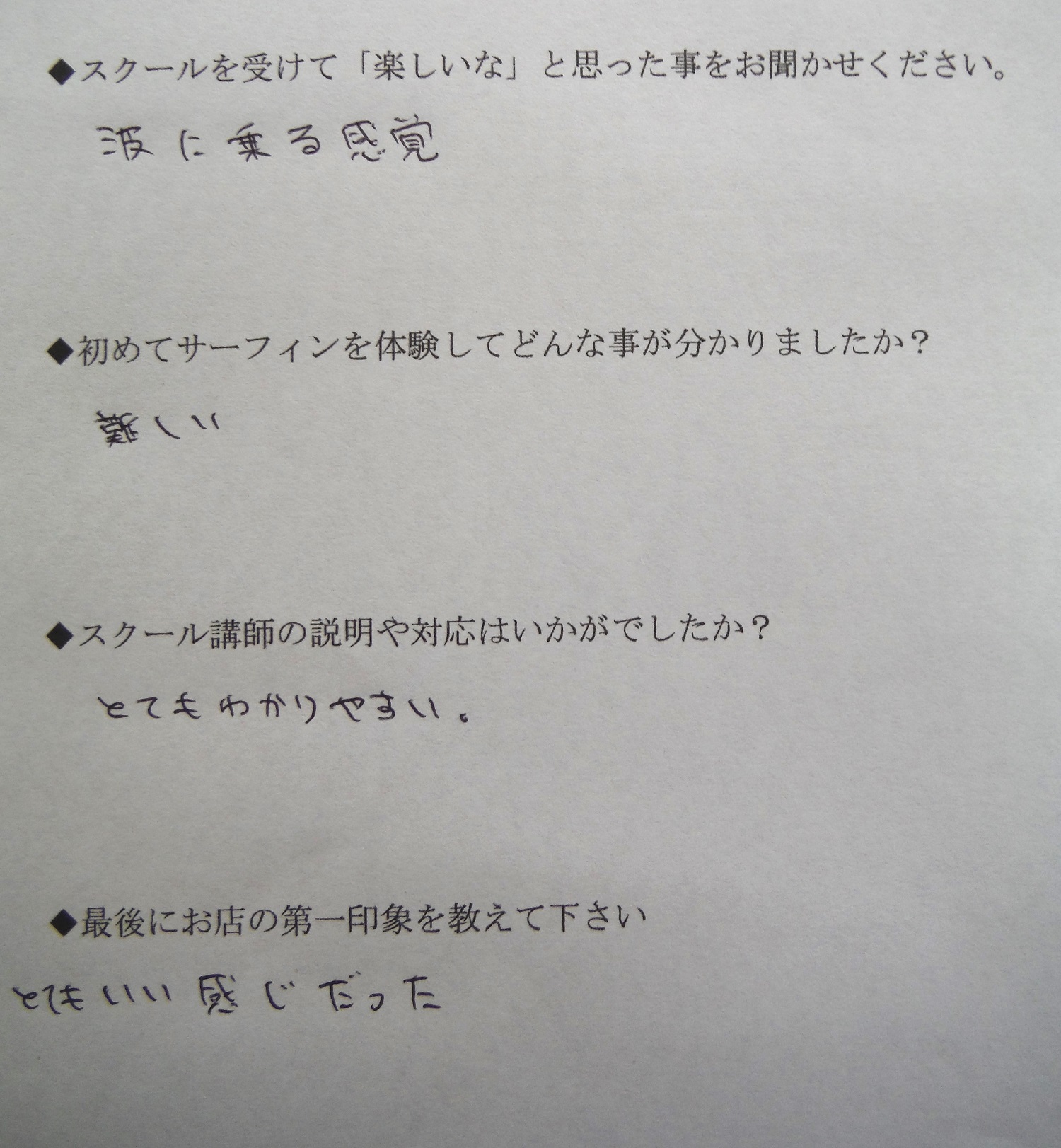 2014年05月27日 サーフィンスクール お客様の声 vol.045 スクールを受けて「楽しいな」と思った事をお聞かせください ・波に乗る感覚 初めてサーフィンを体験してどんな事が分かりましたか? ・難しい スクール講師の説明や対応はいかがでしたか? ・とてもわかりやすい。 最後にお店の第一印象を教えてください ・とてもいい感じだった \ この投稿をSNSでシェアする / ポケット 前後の記事 « サーフィンスクール お客様の声 vol.044 サーフィンスクール お客様の声 vol.046 »