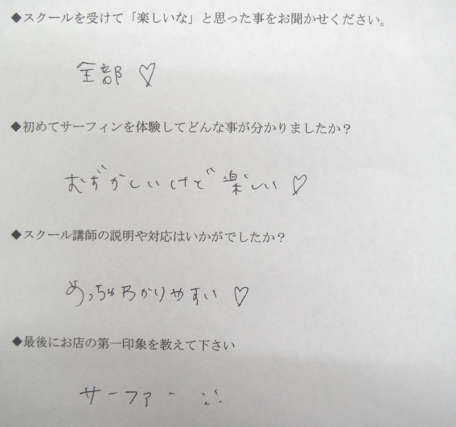 2014年06月07日 サーフィンスクール お客様の声 vol.048 スクールを受けて「楽しいな」と思った事をお聞かせください ・全部♡ 初めてサーフィンを体験してどんな事が分かりましたか? ・むずかしいけど楽しい♡ スクール講師の説明や対応はいかがでしたか? ・めっちゃ分かりやすい♡ 最後にお店の第一印象を教えてください ・サーファー!! \ この投稿をSNSでシェアする / ポケット 前後の記事 « サーフィンスクール お客様の声 vol.047 サーフィンスクール お客様の声 vol.049 »