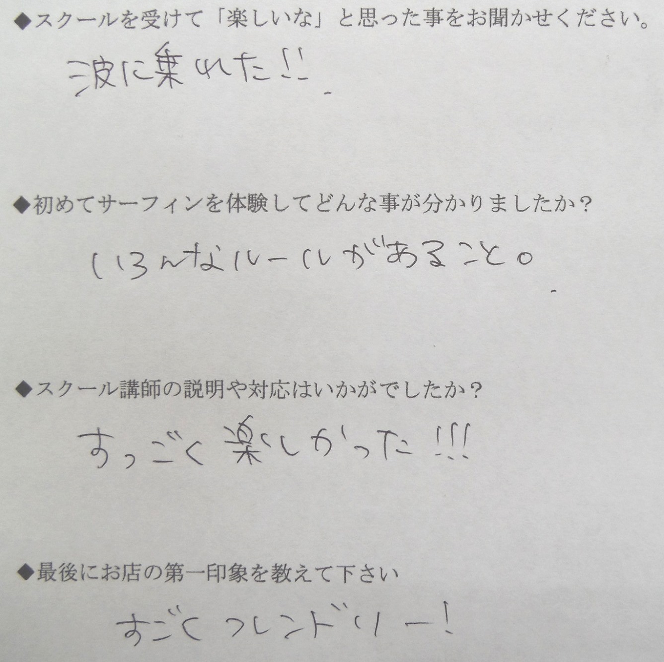 2014年07月05日 サーフィンスクール お客様の声 vol.083 スクールを受けて「楽しいな」と思った事をお聞かせください ・波に乗れた!! 初めてサーフィンを体験してどんな事が分かりましたか? ・いろんなルールがあること。 スクール講師の説明や対応はいかがでしたか? ・すっごく楽しかった!!! 最後にお店の第一印象を教えてください ・すごくフレンドリー! \ この投稿をSNSでシェアする / ポケット 前後の記事 « サーフィンスクール お客様の声 vol.082 サーフィンスクール お客様の声 vol.084 »