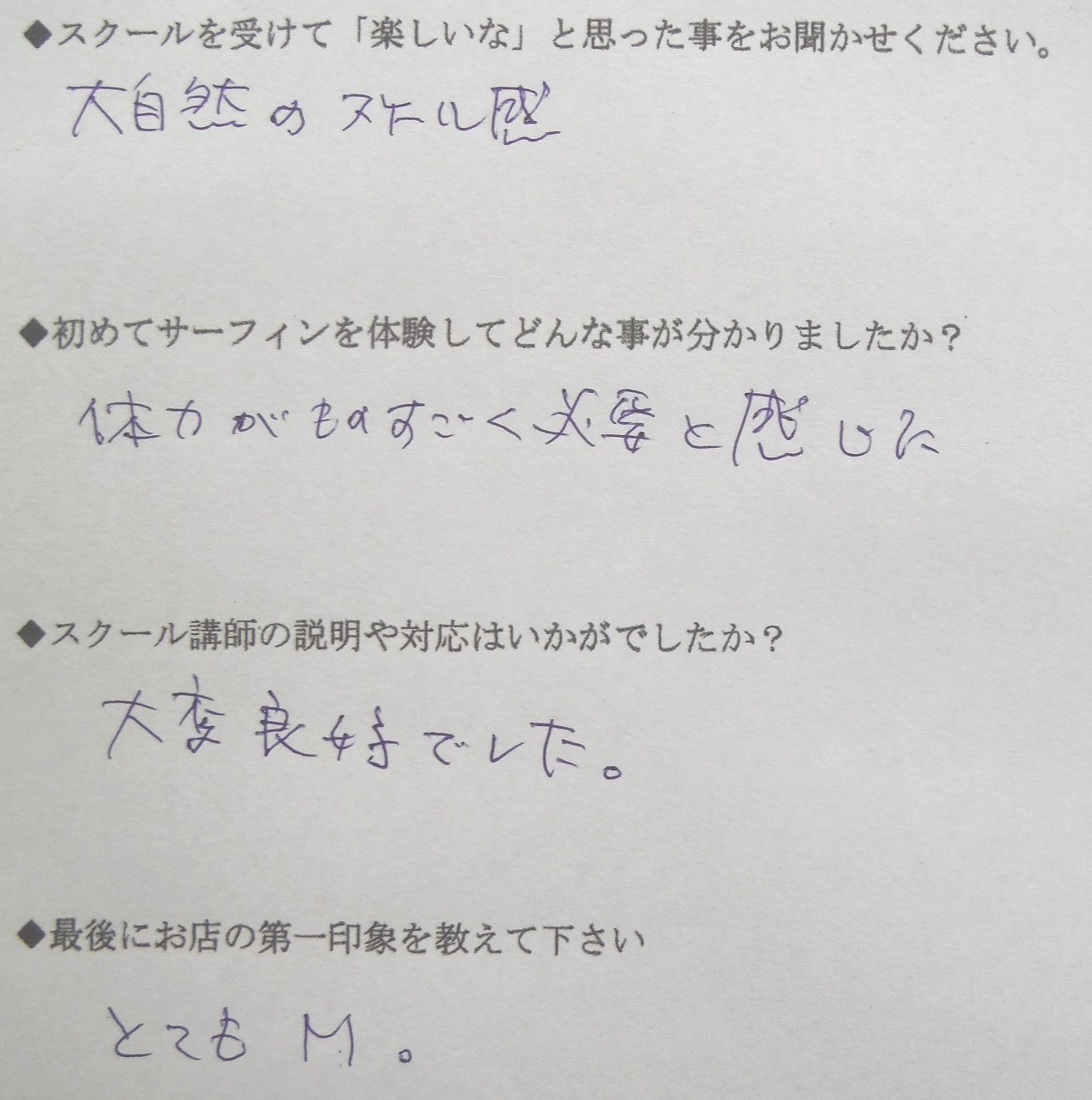 2014年08月09日 サーフィンスクール お客様の声 vol.111 スクールを受けて「楽しいな」と思った事をお聞かせください ・大自然のスケール感 初めてサーフィンを体験してどんな事が分かりましたか? ・体力がものすごく必要と感じた スクール講師の説明や対応はいかがでしたか? ・大変良好でした。 最後にお店の第一印象を教えてください ・とてもM \ この投稿をSNSでシェアする / ポケット 前後の記事 « サーフィンスクール お客様の声 vol.110 サーフィンスクール お客様の声 vol.112 »