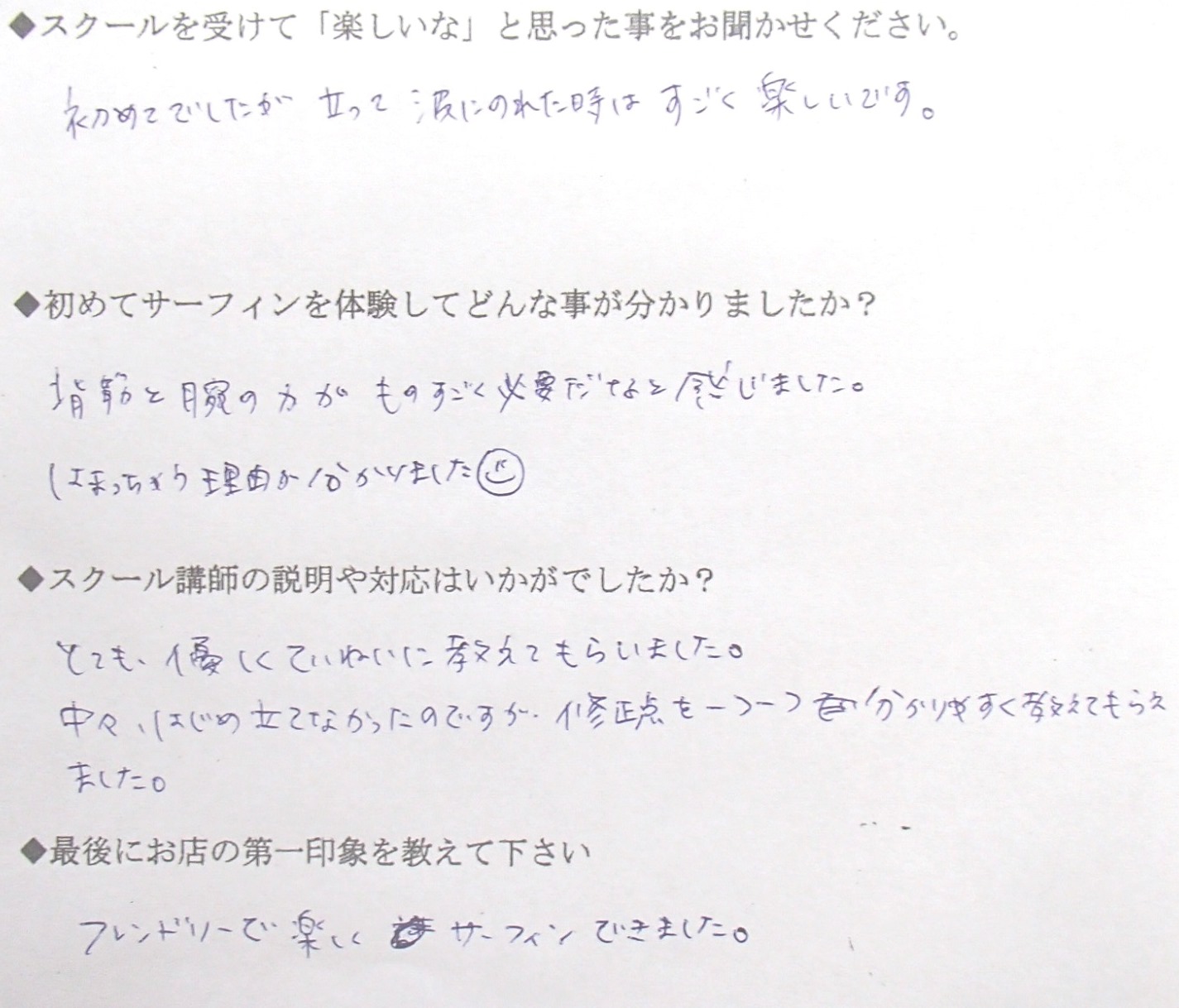 ・初めてでしたが立って波に乗れた時はすごく楽しいです。