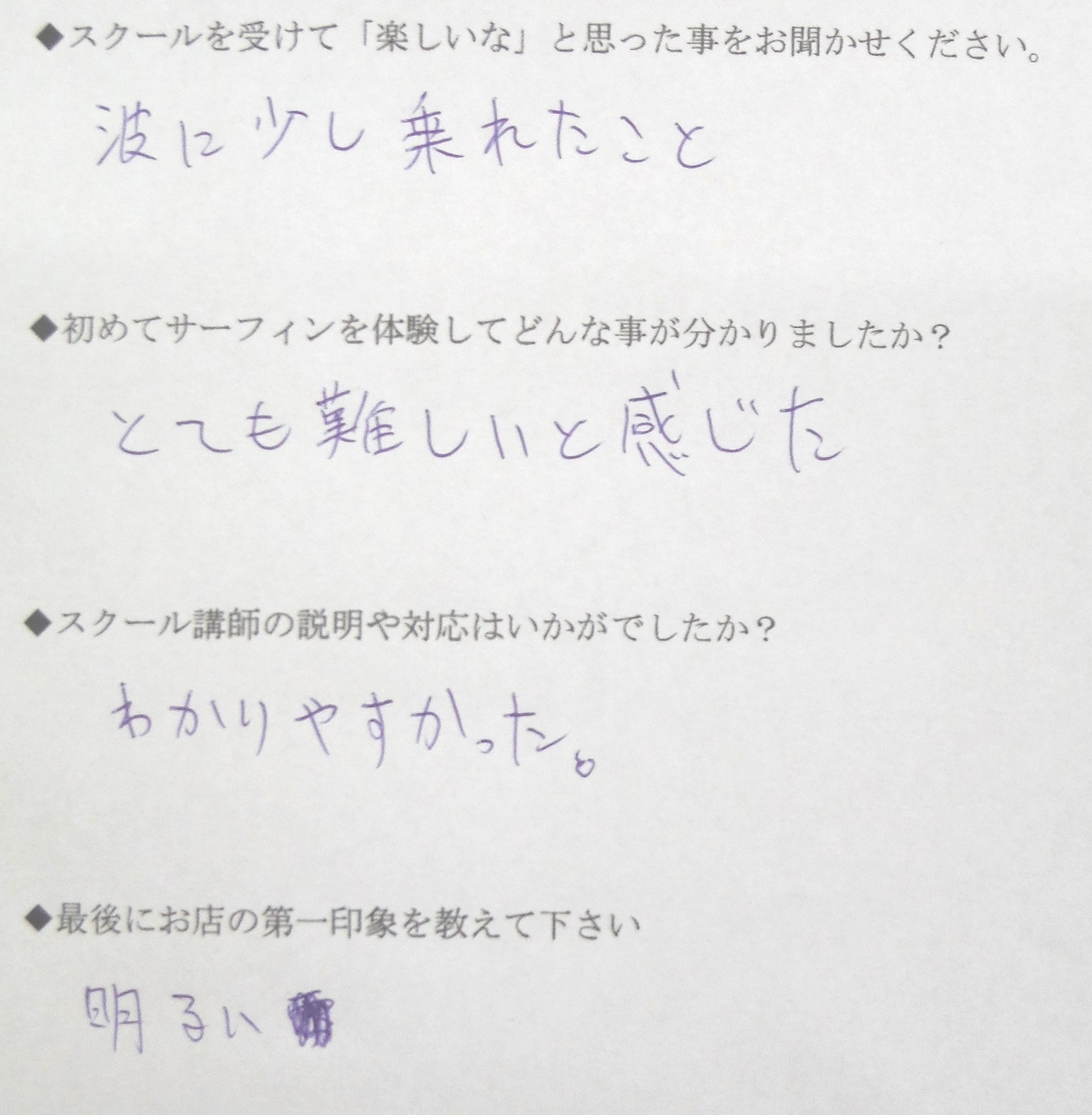2014年09月07日 サーフィンスクール お客様の声 vol.138 スクールを受けて「楽しいな」と思った事をお聞かせください ・波に少し乗れたこと 初めてサーフィンを体験してどんな事が分かりましたか? ・とても難しいと感じた スクール講師の説明や対応はいかがでしたか? ・わかりやすかった。 最後にお店の第一印象を教えてください ・明るい \ この投稿をSNSでシェアする / ポケット 前後の記事 « サーフィンスクール お客様の声 vol.137 サーフィンスクール お客様の声 vol.139 »