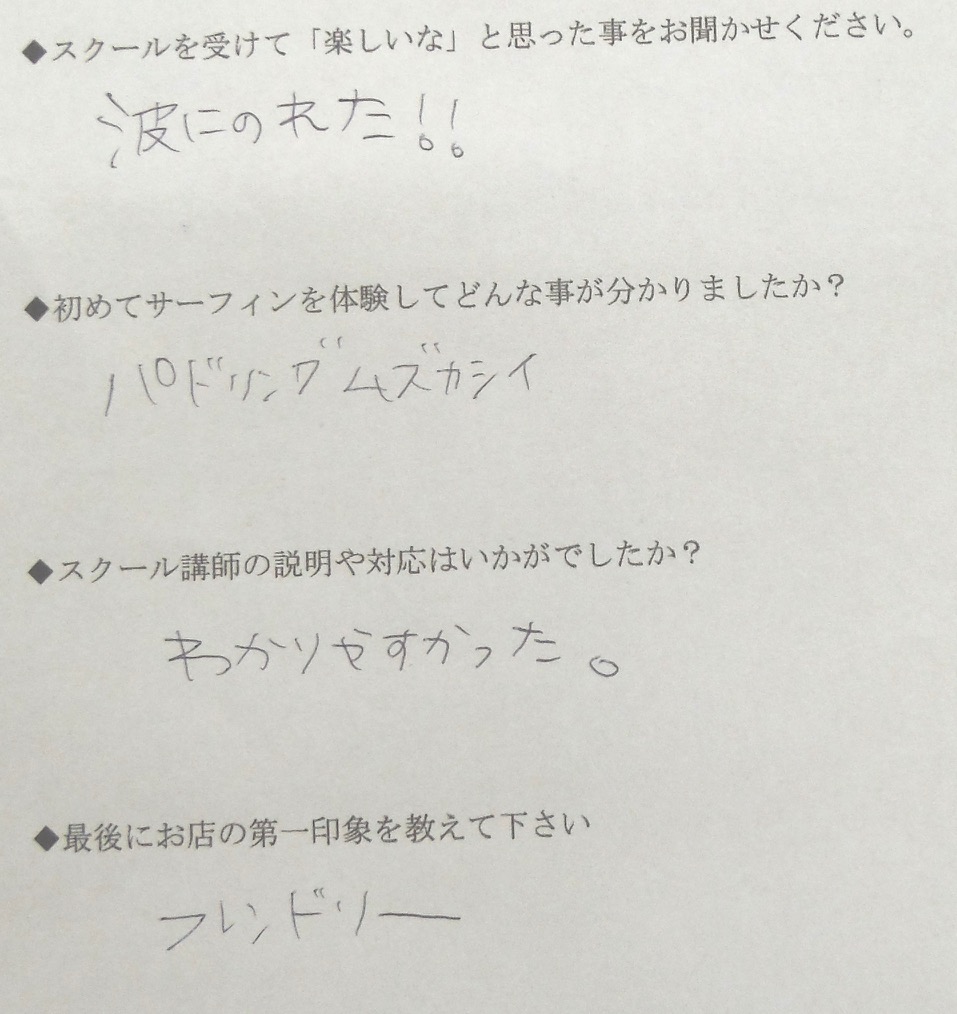 2014年09月09日 サーフィンスクール お客様の声 vol.141 スクールを受けて「楽しいな」と思った事をお聞かせください ・波にのれた!! 初めてサーフィンを体験してどんな事が分かりましたか? ・パドリングムズカシイ スクール講師の説明や対応はいかがでしたか? ・分かりやすかった。 最後にお店の第一印象を教えてください ・フレンドリー \ この投稿をSNSでシェアする / ポケット 前後の記事 « サーフィンスクール お客様の声 vol.140 サーフィンスクール お客様の声 vol.142 »