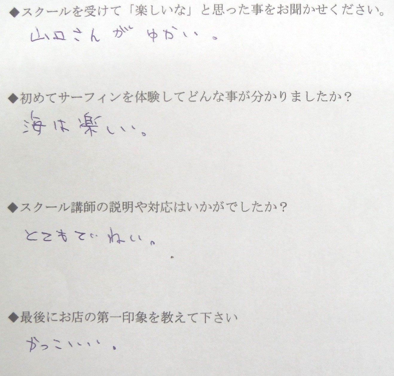 2014年09月29日 サーフィンスクール お客様の声 vol.164 スクールを受けて「楽しいな」と思った事をお聞かせください ・山口さんがゆかい 初めてサーフィンを体験してどんな事が分かりましたか? ・海は楽しい スクール講師の説明や対応はいかがでしたか? ・とてもていねい 最後にお店の第一印象を教えてください ・かっこいい \ この投稿をSNSでシェアする / ポケット 前後の記事 « サーフィンスクール お客様の声 vol.163 サーフィンスクール お客様の声 vol.165 »