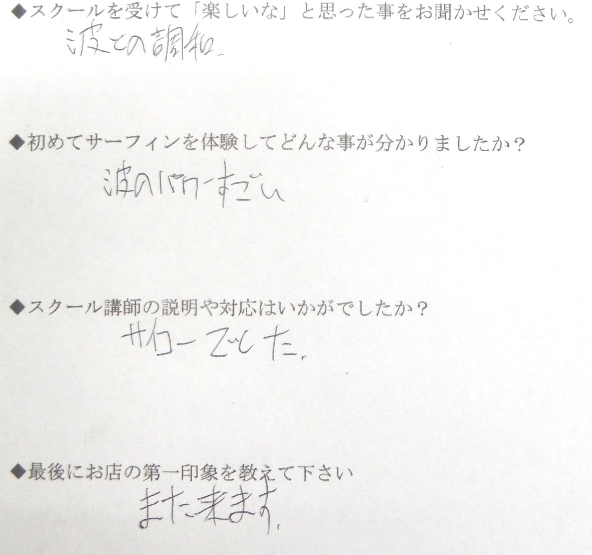2014年09月29日 サーフィンスクール お客様の声 vol.165 スクールを受けて「楽しいな」と思った事をお聞かせください ・波との調和 初めてサーフィンを体験してどんな事が分かりましたか? ・波のパワーすごい スクール講師の説明や対応はいかがでしたか? ・サイコーでした 最後にお店の第一印象を教えてください ・また来ます \ この投稿をSNSでシェアする / ポケット 前後の記事 « サーフィンスクール お客様の声 vol.164 サーフィンスクール お客様の声 vol.166 »