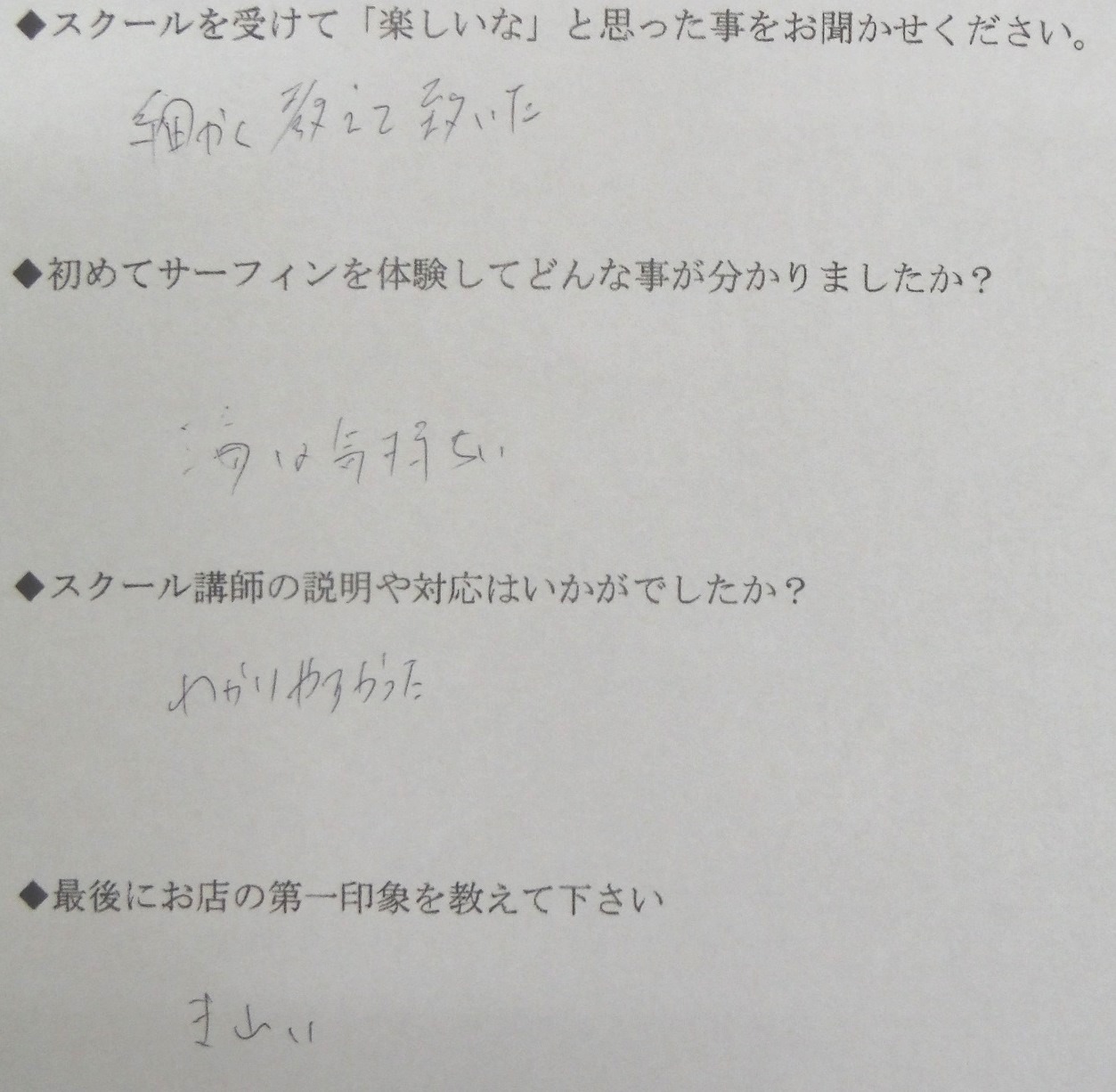 2014年09月29日 サーフィンスクール お客様の声 vol.166 スクールを受けて「楽しいな」と思った事をお聞かせください ・細かく教えて頂いた 初めてサーフィンを体験してどんな事が分かりましたか? ・海は気持ちい スクール講師の説明や対応はいかがでしたか? ・わかりやすかった 最後にお店の第一印象を教えてください ・きれい \ この投稿をSNSでシェアする / ポケット 前後の記事 « サーフィンスクール お客様の声 vol.165 サーフィンスクール お客様の声 vol.167 »