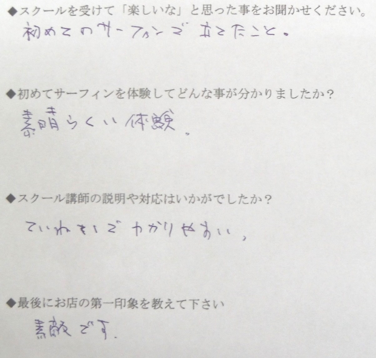 2014年09月29日 サーフィンスクール お客様の声 vol.168 スクールを受けて「楽しいな」と思った事をお聞かせください ・初めてのサーフィンで立てたこと 初めてサーフィンを体験してどんな事が分かりましたか? ・素晴らしい体験 スクール講師の説明や対応はいかがでしたか? ・ていねいで分かりやすい 最後にお店の第一印象を教えてください ・素敵です \ この投稿をSNSでシェアする / ポケット 前後の記事 « サーフィンスクール お客様の声 vol.167 サーフィンスクール お客様の声 vol.169 »