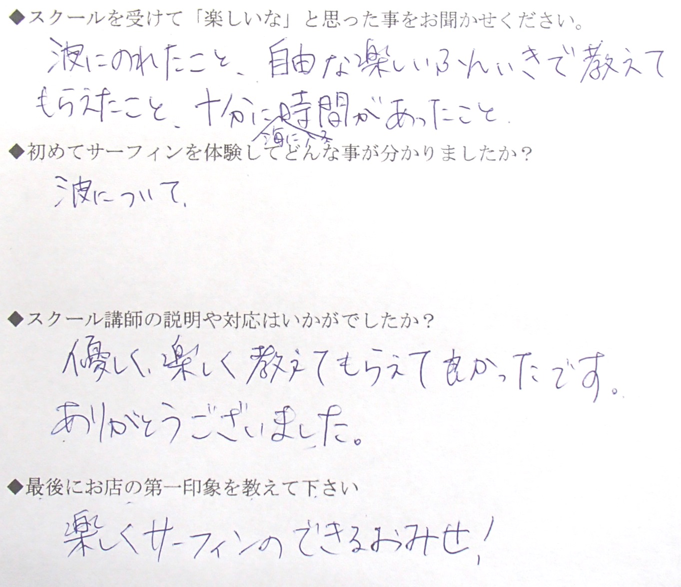 ・波にのれたこと、自由な楽しいふんいきで教えてもらえたこと、