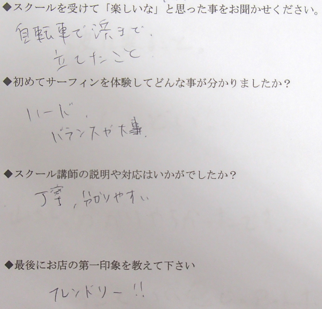 2015年01月18日 サーフィンスクール お客様の声 vol.203 スクールを受けて「楽しいな」と思った事をお聞かせください ・自転車で浜まで立てたこと 初めてサーフィンを体験してどんな事が分かりましたか? ・ハード、バランスが大事 スクール講師の説明や対応はいかがでしたか? ・丁寧・分かりやすい 最後にお店の第一印象を教えてください ・フレンドリー \ この投稿をSNSでシェアする / ポケット 前後の記事 « サーフィンスクール お客様の声 vol.202 サーフィンスクール お客様の声 vol.204 »