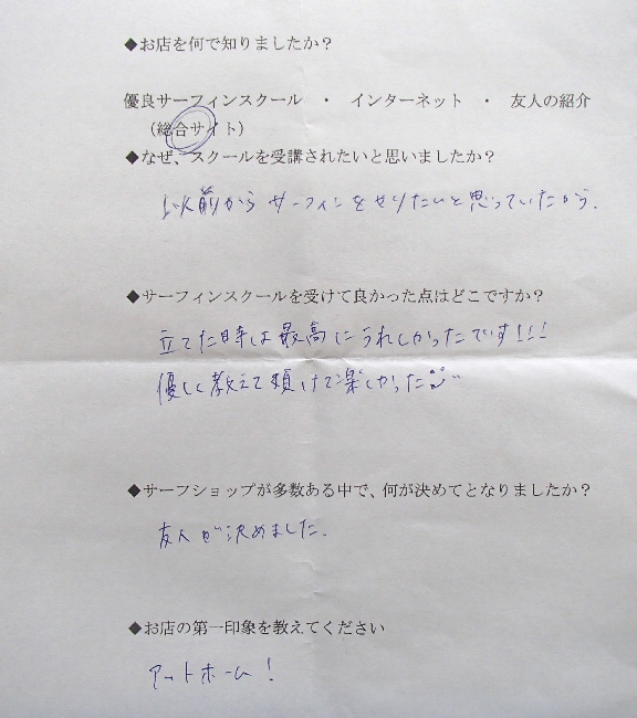 2014年01月03日 サーフィンスクール お客様の声 vol.003 なぜ、スクールを受講されたいと思いましたか? 以前からサーフィンをやりたいと思っていたから サーフィンスクールを受けて良かった点は? 立てた時は最高にうれしかったです!!!優しく教えて頂けて楽しかった(^.^) お店の第一印象を教えてください。 アットホーム! \ この投稿をSNSでシェアする / ポケット 前後の記事 « サーフィンスクール お客様の声 vol.002 サーフィンスクール お客様の声 vol.004 »